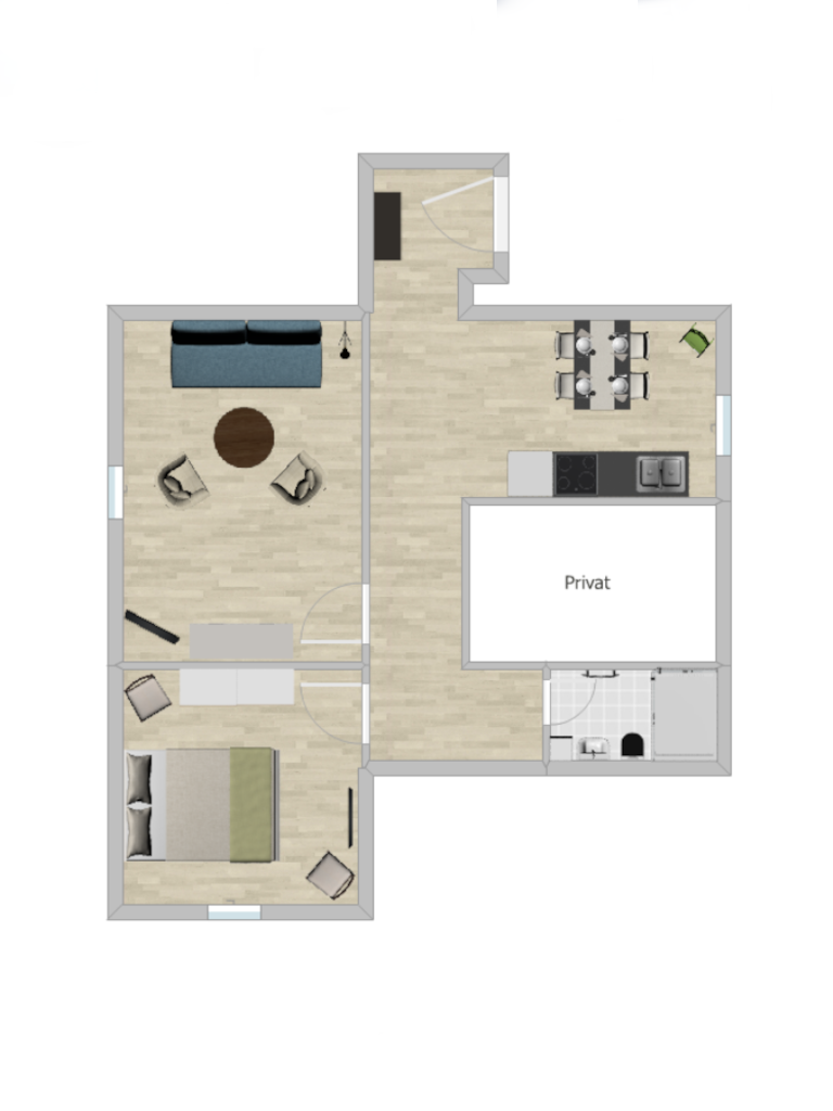 - Wohnzimmer, Schlafzimmer, Küche und Bad